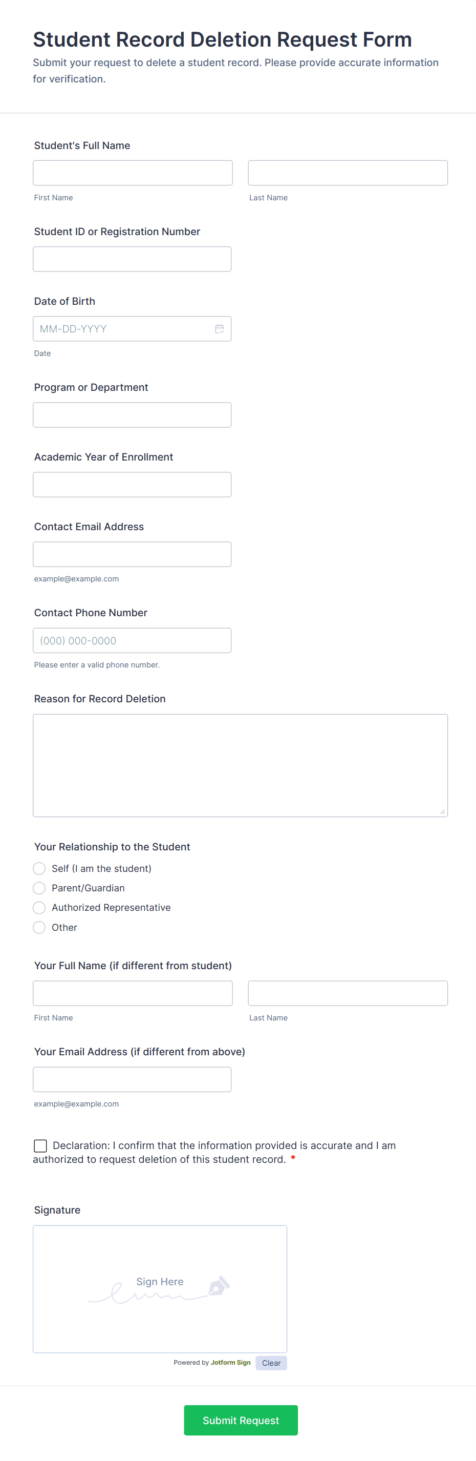 With Jotform, users can easily create, customize, and deploy request forms tailored to their specific needs. Thanks to Jotform’s intuitive drag-and-drop Form Builder, anyone can design a professional-looking request form without any coding knowledge. Users can add fields, set up conditional logic, integrate with payment gateways, and automate notifications to streamline the entire request process. Submissions are automatically organized in Jotform Tables, making it simple to track, manage, and respond to requests efficiently. Whether you’re a business, school, nonprofit, or government agency, Jotform’s request forms help you collect and process requests with ease.