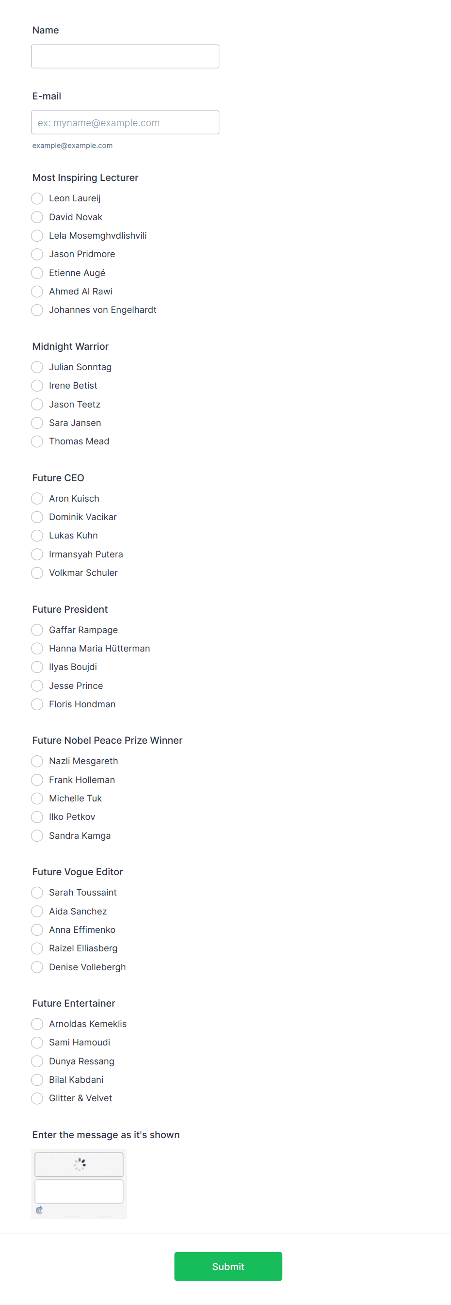 Award forms are specialized online forms designed to streamline the process of nominating, evaluating, and selecting individuals or organizations for various awards and recognitions. These forms are commonly used by educational institutions, businesses, non-profits, and event organizers to collect nominations, applications, or votes for awards such as employee of the month, academic scholarships, community service honors, or industry-specific accolades. Award forms help standardize the information collected, ensuring that all nominees are evaluated fairly and consistently. They can be tailored to suit a wide range of award types, from simple peer nominations to complex multi-stage judging processes.