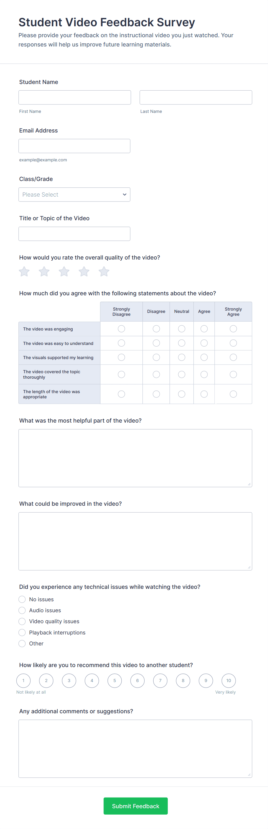A class feedback survey is a form template designed to collect feedback about the course from their students.