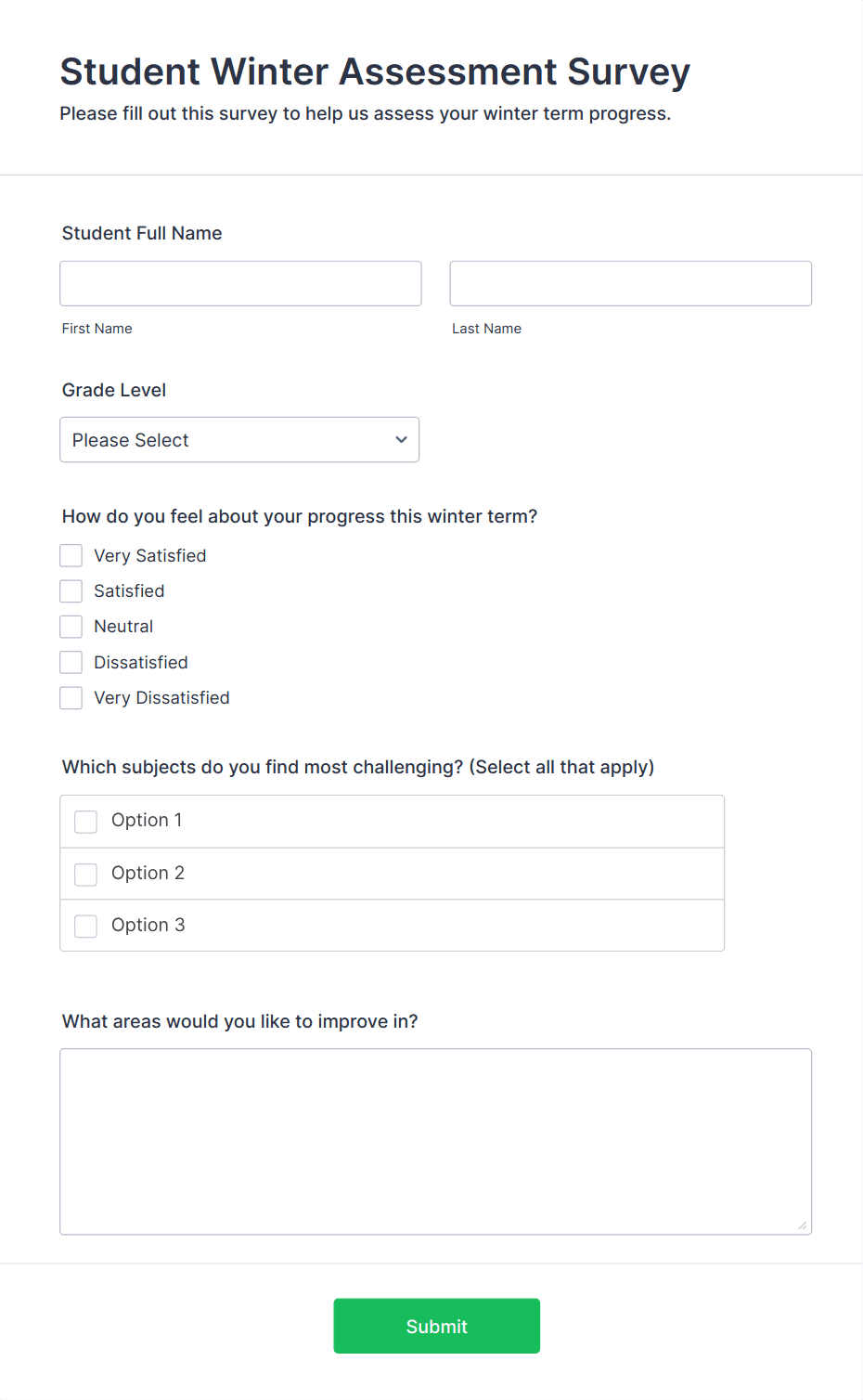 • For teacher or staff surveys: Include self-assessment fields, peer review sections, and narrative response options.