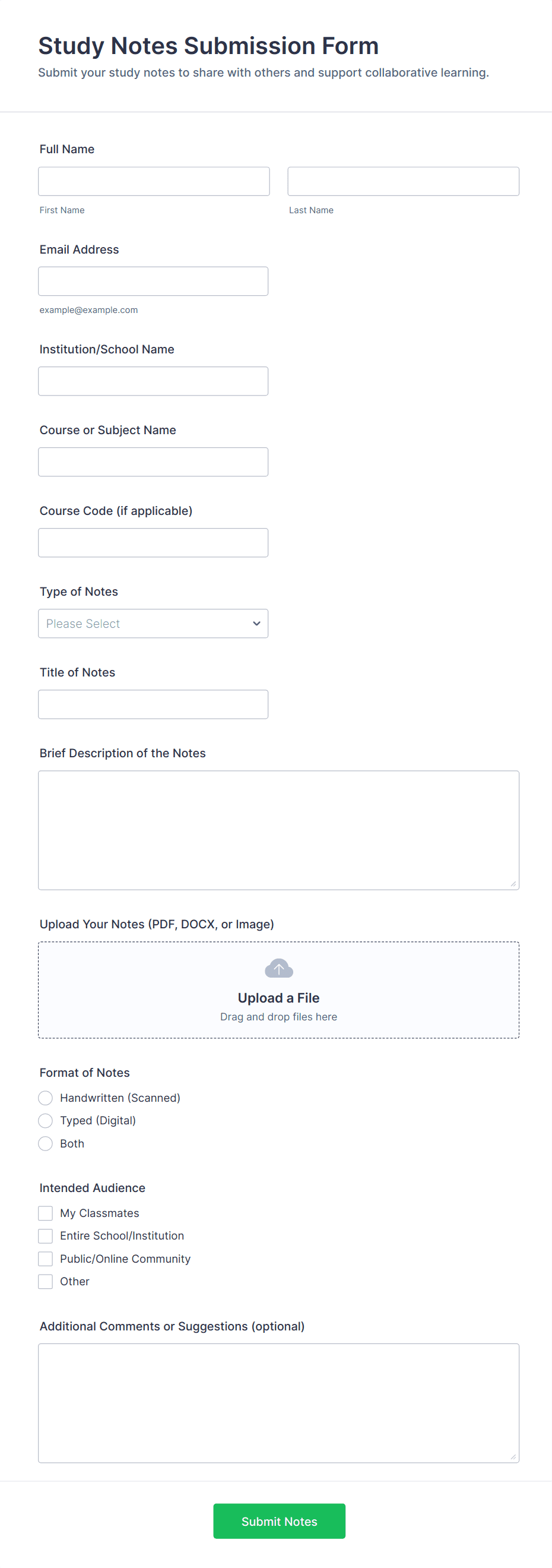 • Assignment Submissions: Include fields for course name, assignment title, and student ID.