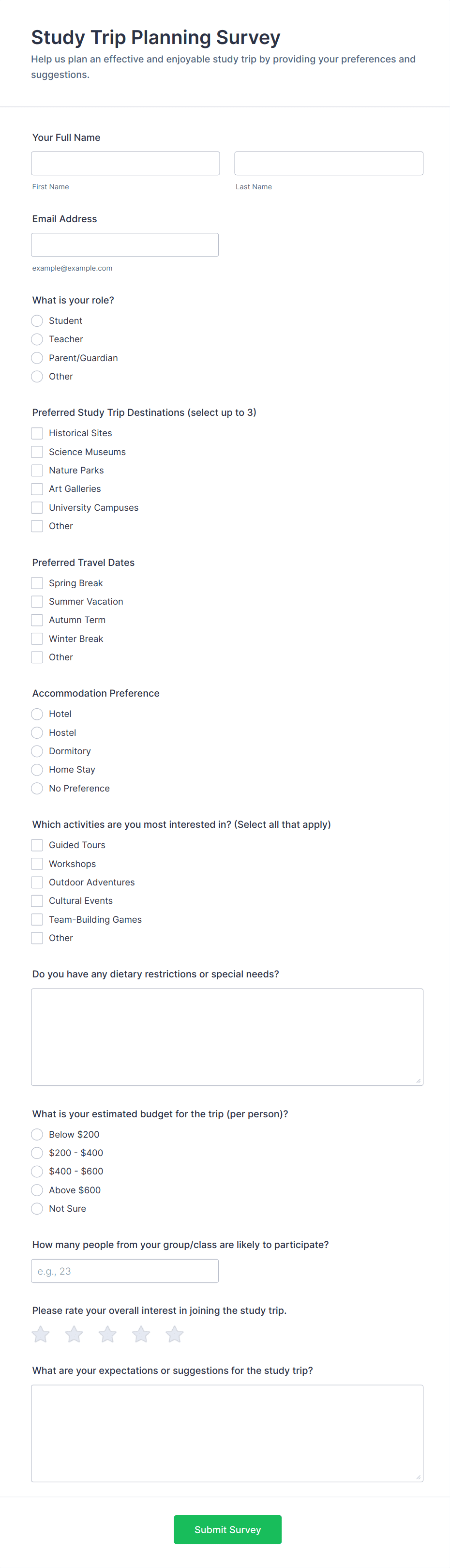 - For student or parent surveys, add questions about satisfaction, communication, and support services.
