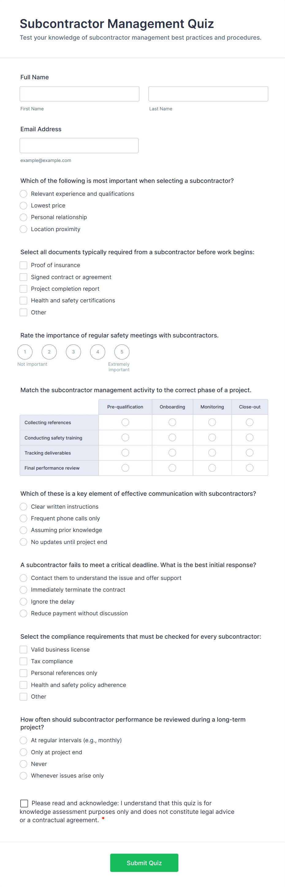 • For educational or compliance quizzes, include a mix of question types and set correct answers for automatic scoring.