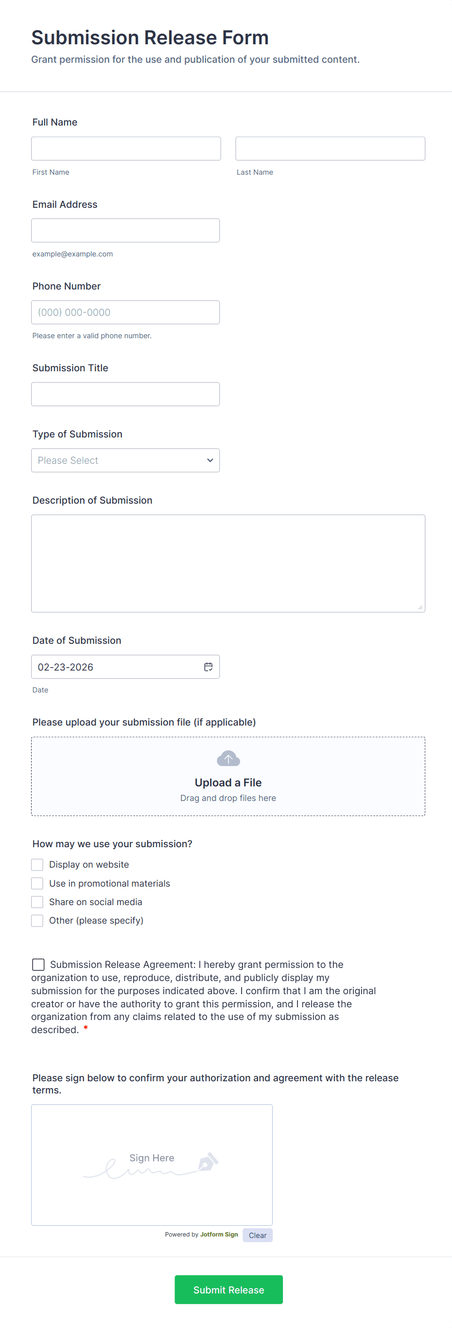 A media release form lets you collect and store information related to press releases and media releases. Focus on your next press release without worrying about losing a single piece of important information with Jotform!