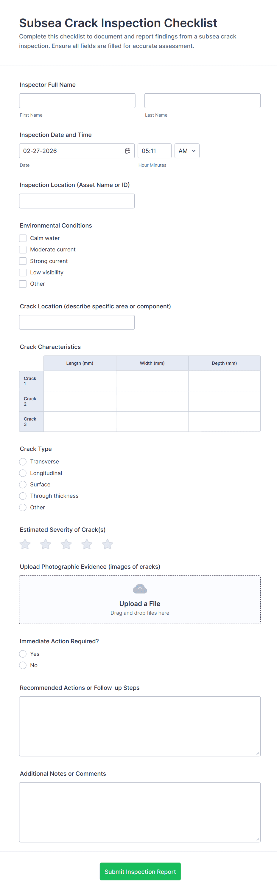 Field Inspection Form Templates are specialized digital forms designed to streamline the process of collecting, recording, and managing inspection data in various field environments. These templates are commonly used by professionals in industries such as construction, real estate, facility management, agriculture, environmental services, and safety compliance. They help inspectors document site conditions, equipment status, safety hazards, maintenance needs, and regulatory compliance during on-site visits. By standardizing the inspection process, these templates ensure that all necessary information is captured accurately and efficiently, reducing the risk of oversight and improving reporting consistency.