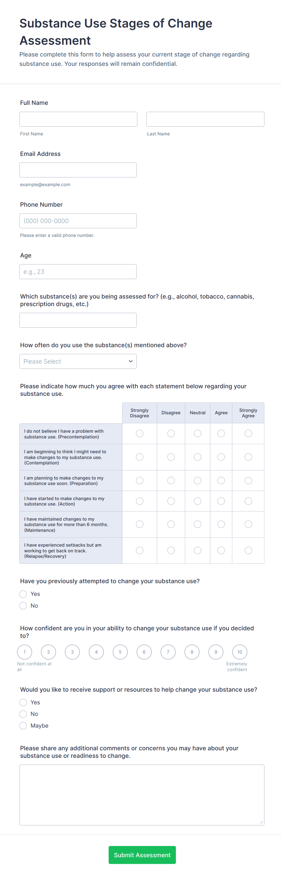 Healthcare assessment forms are structured documents used to collect and evaluate patient health information to support clinical decisions, care planning, and ongoing monitoring. They help healthcare teams capture consistent details about symptoms, medical history, risk factors, functional status, and care needs in a clear and organized way. Healthcare assessment forms are commonly used in clinics, hospitals, telehealth services, rehabilitation centers, home care, and specialty practices for intake assessments, screening evaluations, follow-up check-ins, and condition monitoring. By standardizing assessment workflows, these forms improve documentation quality, reduce missing information, and support safer, more coordinated care.