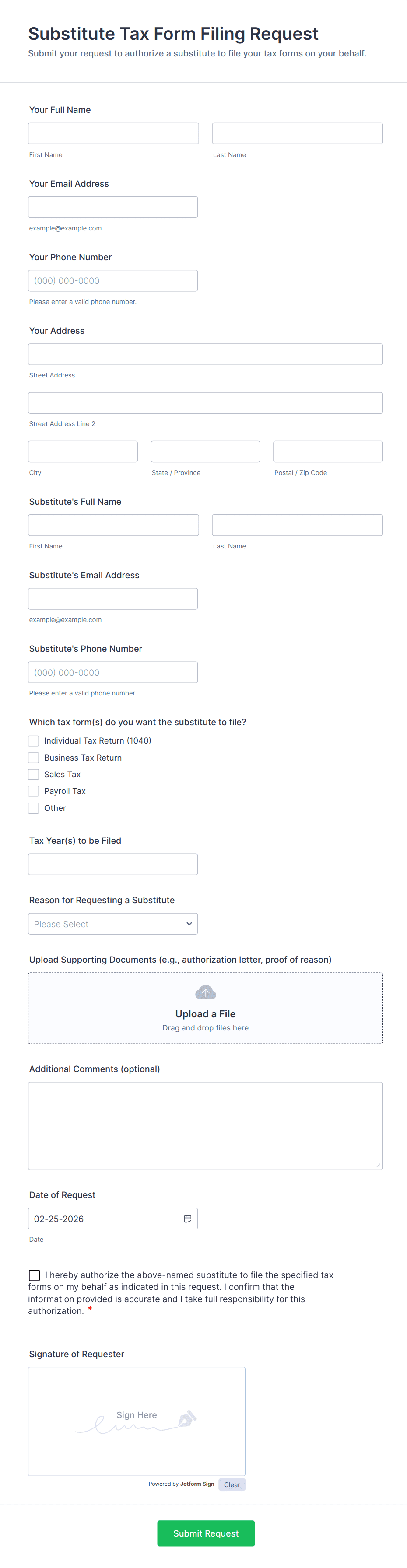 Absolutely. Jotform’s templates can be fully customized to include fields and requirements specific to local, state, or federal tax regulations, ensuring compliance with the relevant laws.