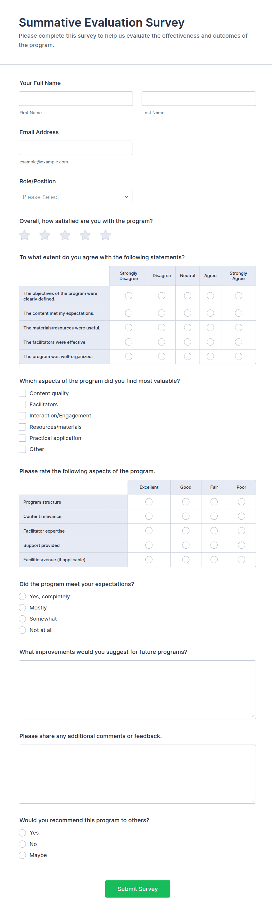 Evaluation surveys are structured tools designed to gather feedback, measure satisfaction, and assess the effectiveness of programs, services, events, or products. They are widely used across various industries and sectors, including education, healthcare, business, and nonprofit organizations, to collect valuable insights from participants, clients, employees, or stakeholders. Common use cases include course evaluations, employee performance reviews, event feedback, customer satisfaction assessments, and program impact studies. By systematically collecting and analyzing responses, organizations can identify strengths, uncover areas for improvement, and make informed decisions to enhance their offerings.