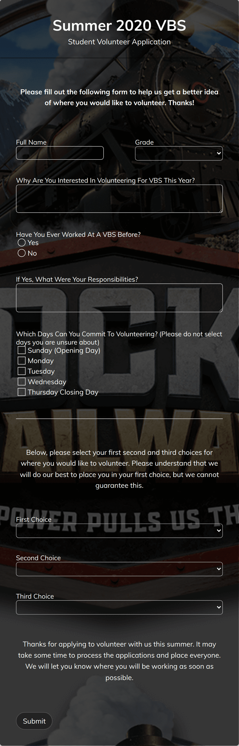 Churches use online forms for new member registration, donations, event and meeting planning, and scheduling visits to your place or worship. Browse one of our online church form templates that will help you gather information of any member, manage volunteer applications, and collect member information and donations easily. Every one of these church form templates are fully customizable and easy to edit.