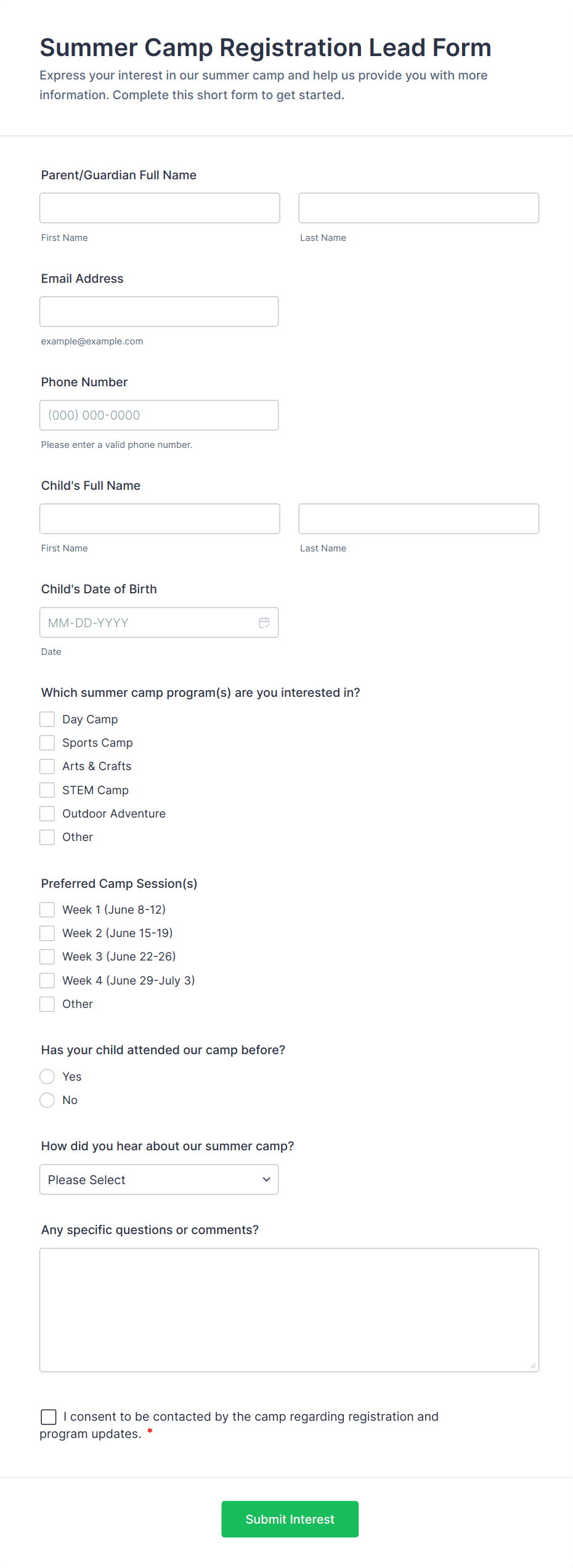Camp Registration Forms are specialized online forms designed to streamline the process of enrolling participants in various types of camps, such as summer camps, sports camps, educational workshops, and overnight retreats. These forms collect essential information from campers and their guardians, including personal details, emergency contacts, medical information, payment preferences, and consent agreements. By digitizing the registration process, camp organizers can efficiently manage participant data, reduce paperwork, and ensure a smooth onboarding experience for both staff and attendees. Use cases range from youth summer camps and day camps to specialized programs like art, science, or leadership camps.