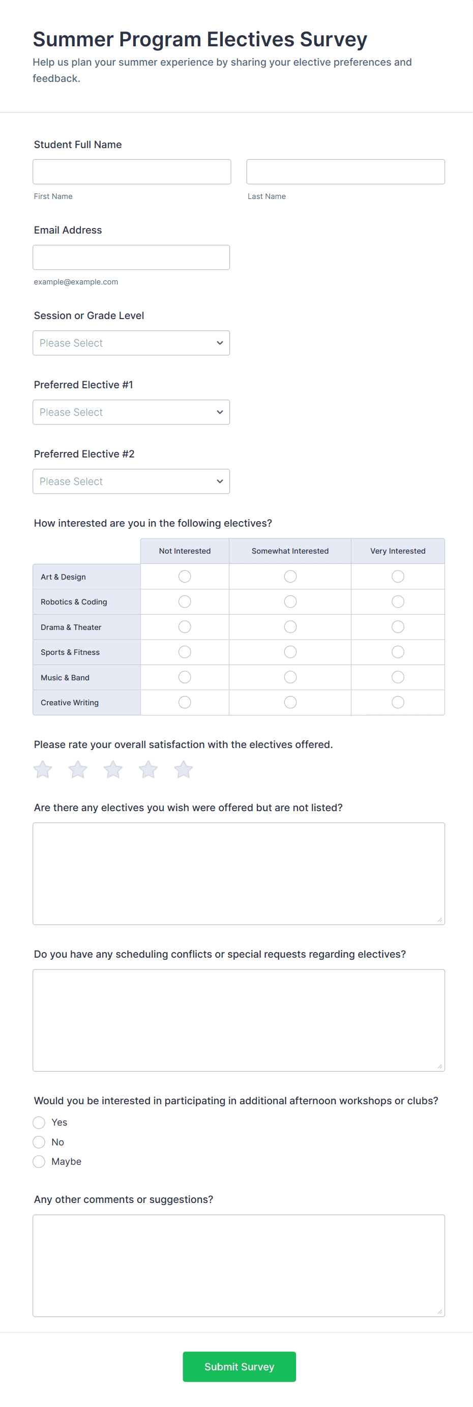 Summer camp surveys are essential tools for gathering feedback, insights, and data from campers, parents, and staff before, during, and after camp sessions. These surveys can cover a wide range of topics, such as camper satisfaction, program effectiveness, staff performance, safety concerns, and suggestions for improvement. By using summer camp surveys, camp organizers can better understand the needs and experiences of their participants, identify areas for enhancement, and ensure that future sessions are even more successful. Common use cases include pre-camp interest surveys, mid-session check-ins, post-camp evaluations, parent feedback forms, and staff assessment surveys.