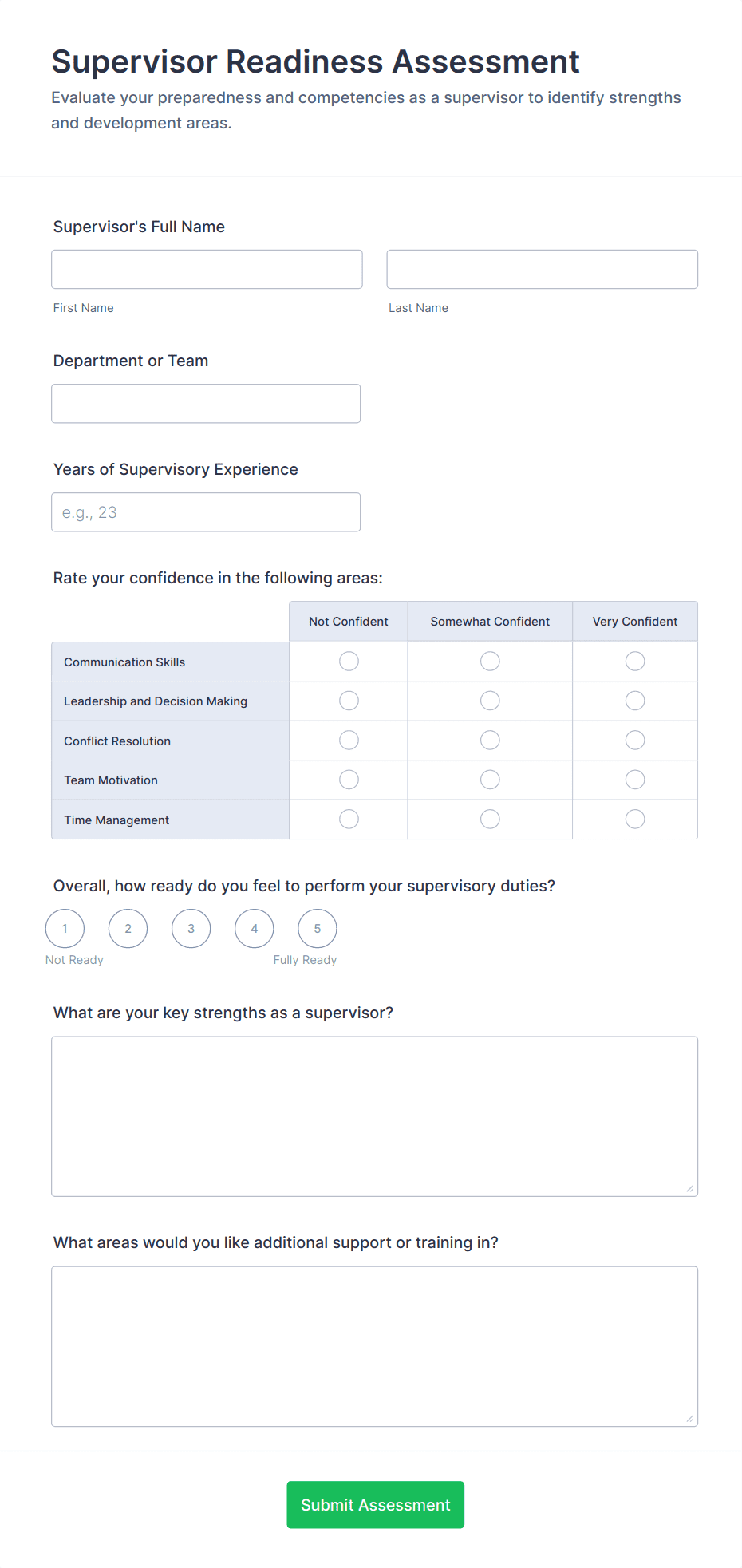 An assessment form is a questionnaire used to make assessments with all necessary metrics included. Go online with no coding!