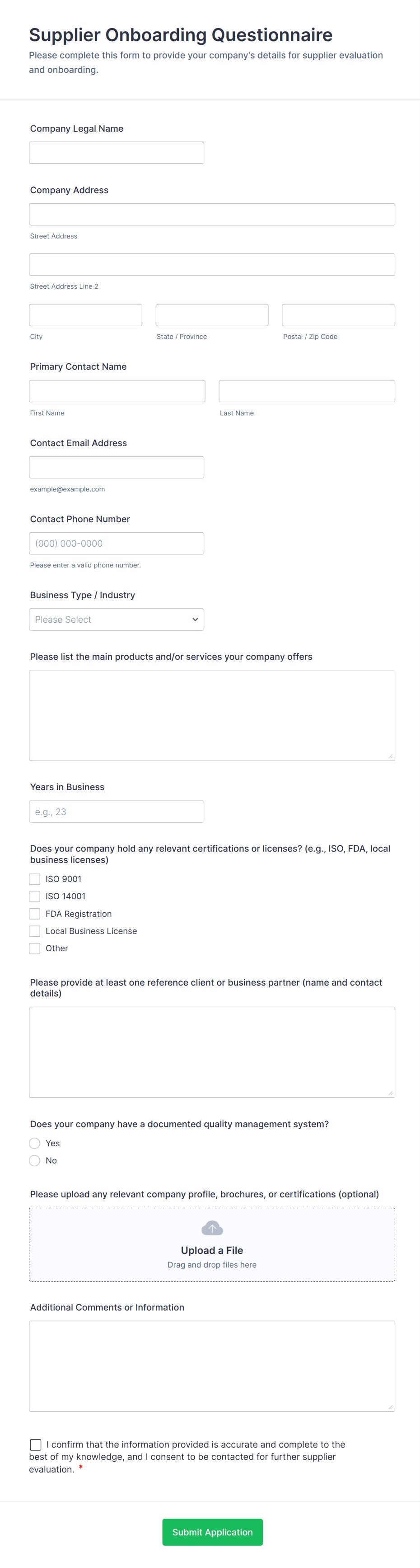Collect supplier name, business type, primary contact, location, and service category. Use dropdowns to standardize categories.