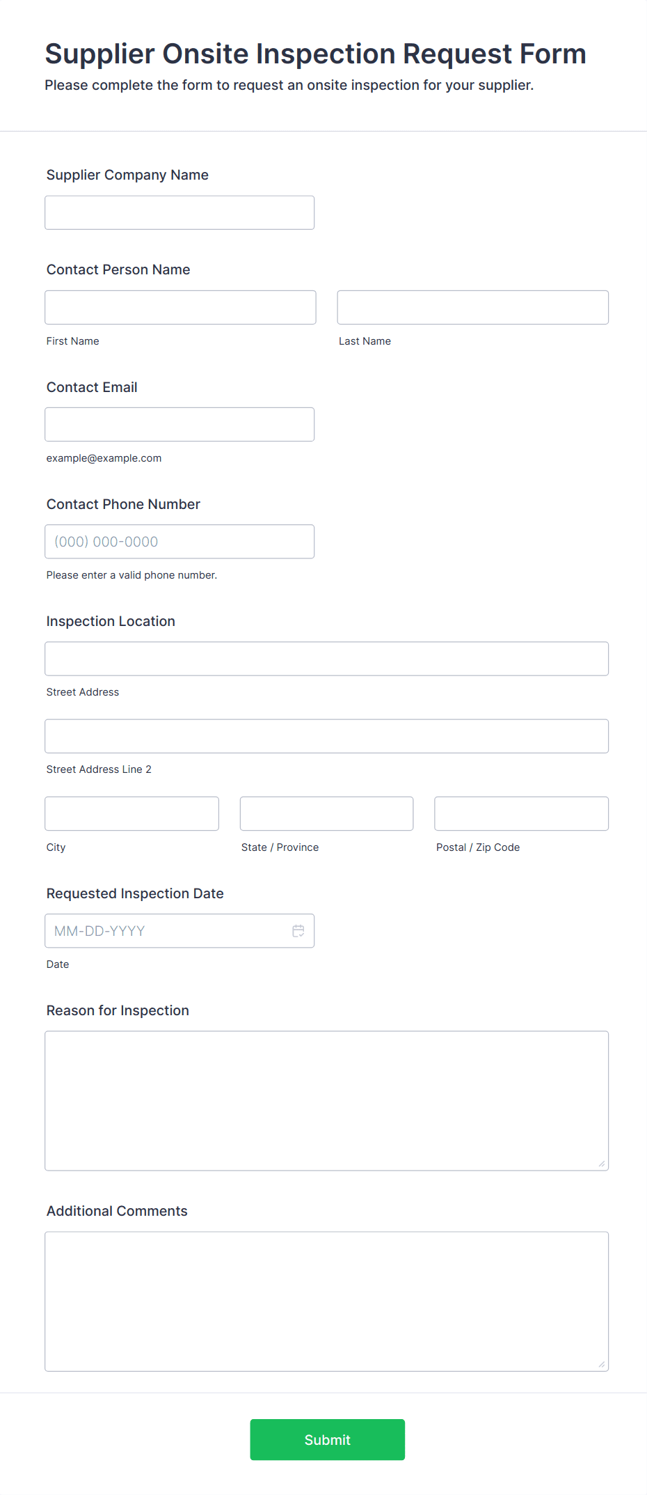 An inspection form is a structured document used to assess, record, and report the condition, compliance, or quality of assets, environments, or processes during an inspection.