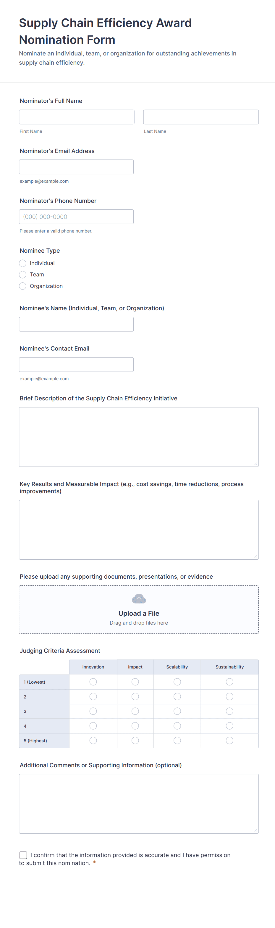 Collect and review nominations for operational excellence with the Supply Chain Efficiency Award Nomination Form in Jotform, ideal for associations, event organizers, and internal teams running supply chain awards.