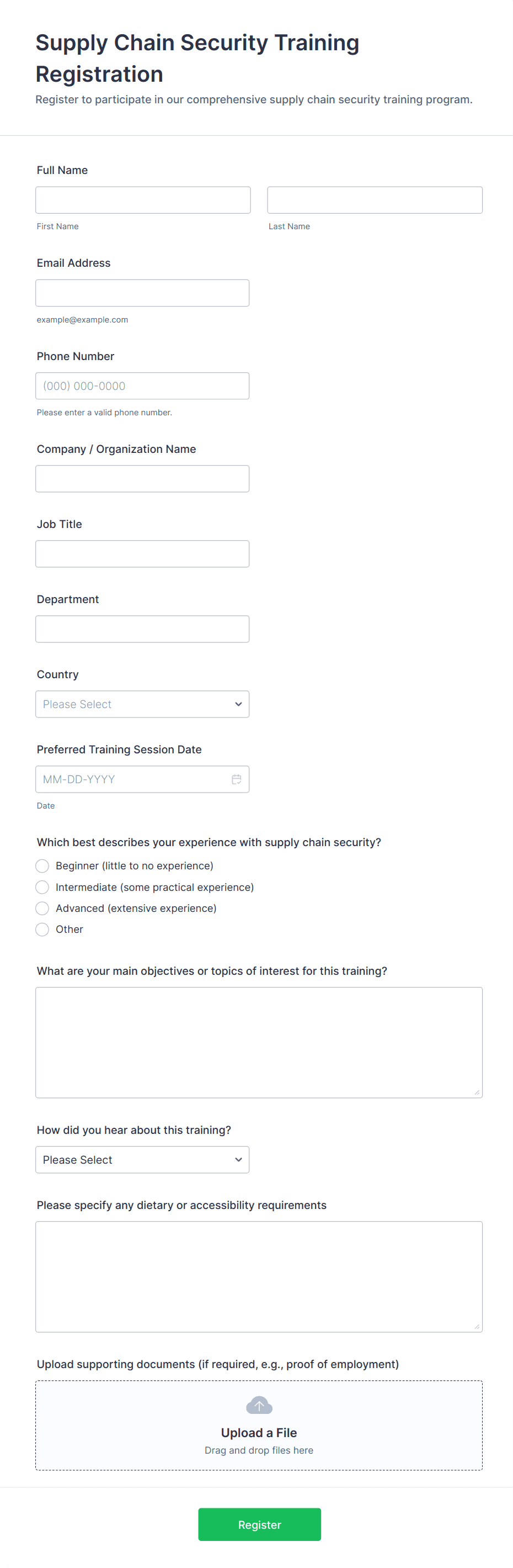Workshop Registration Form Templates are specialized online forms designed to streamline the process of enrolling participants in workshops, seminars, training sessions, and educational events. These templates help organizers efficiently collect essential attendee information such as names, contact details, session preferences, payment details, and special requirements. Whether you’re hosting a hands-on art class, a professional development seminar, or a multi-day technical workshop, these forms can be tailored to fit the unique needs of your event. Use cases range from small community workshops to large-scale industry conferences, making them versatile tools for educators, trainers, event planners, and organizations of all sizes.