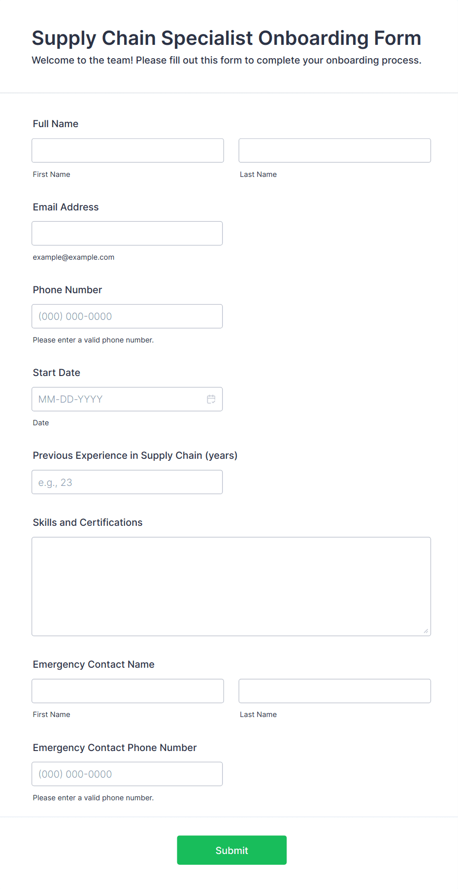 • For job applications, include fields for personal information, education, work experience, references, and file uploads for resumes or cover letters.