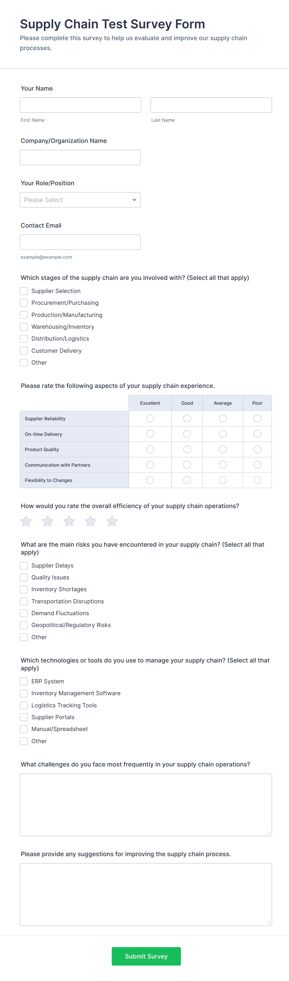 - File upload fields for supporting documentation (useful in audits or supplier evaluations).