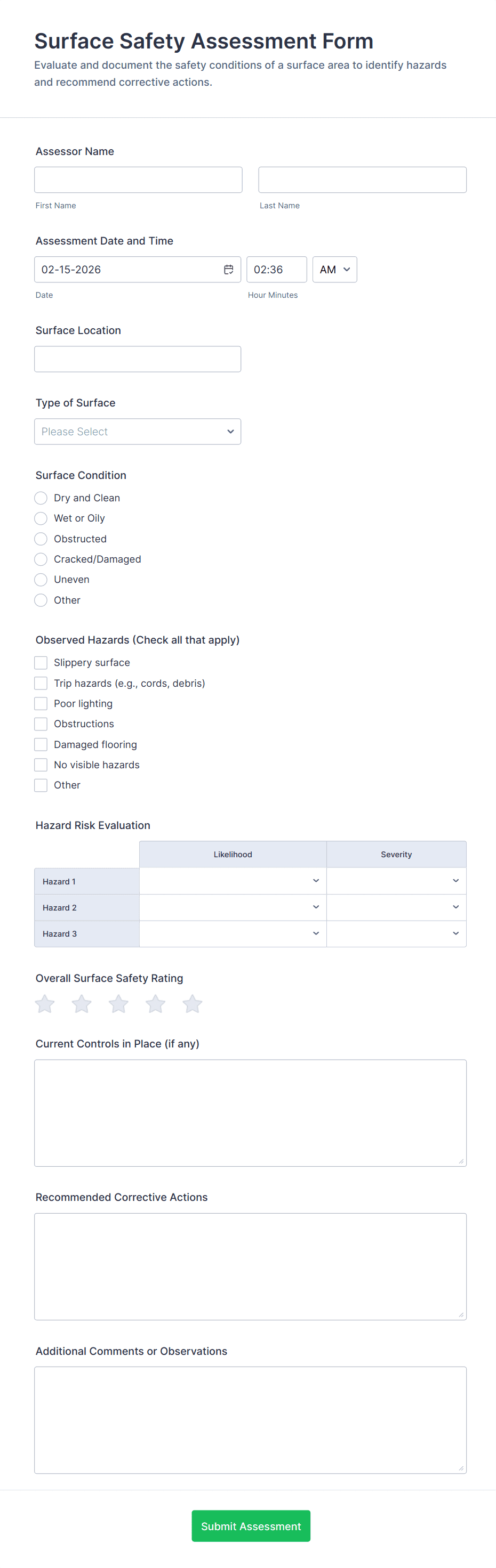 • Conditional Logic: Some forms may use conditional fields to display additional questions based on previous answers (e.g., if a hazard is found, prompt for corrective action details).