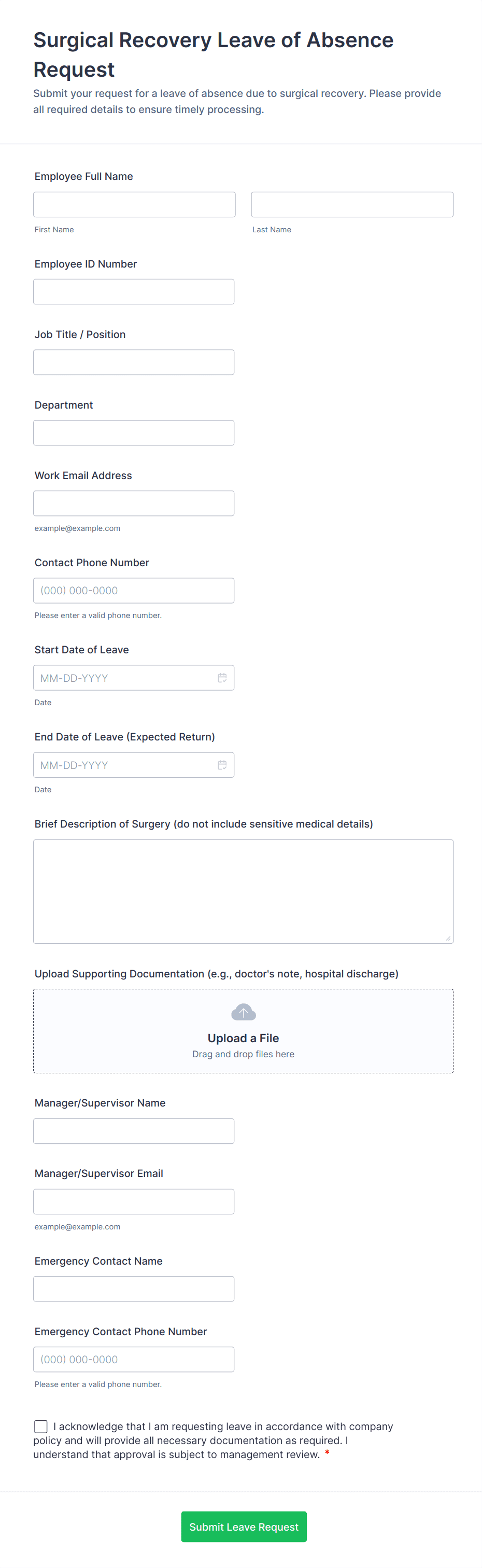Common fields include employee name, department, type of leave, dates of absence, reason for leave, and any required supporting documentation.
