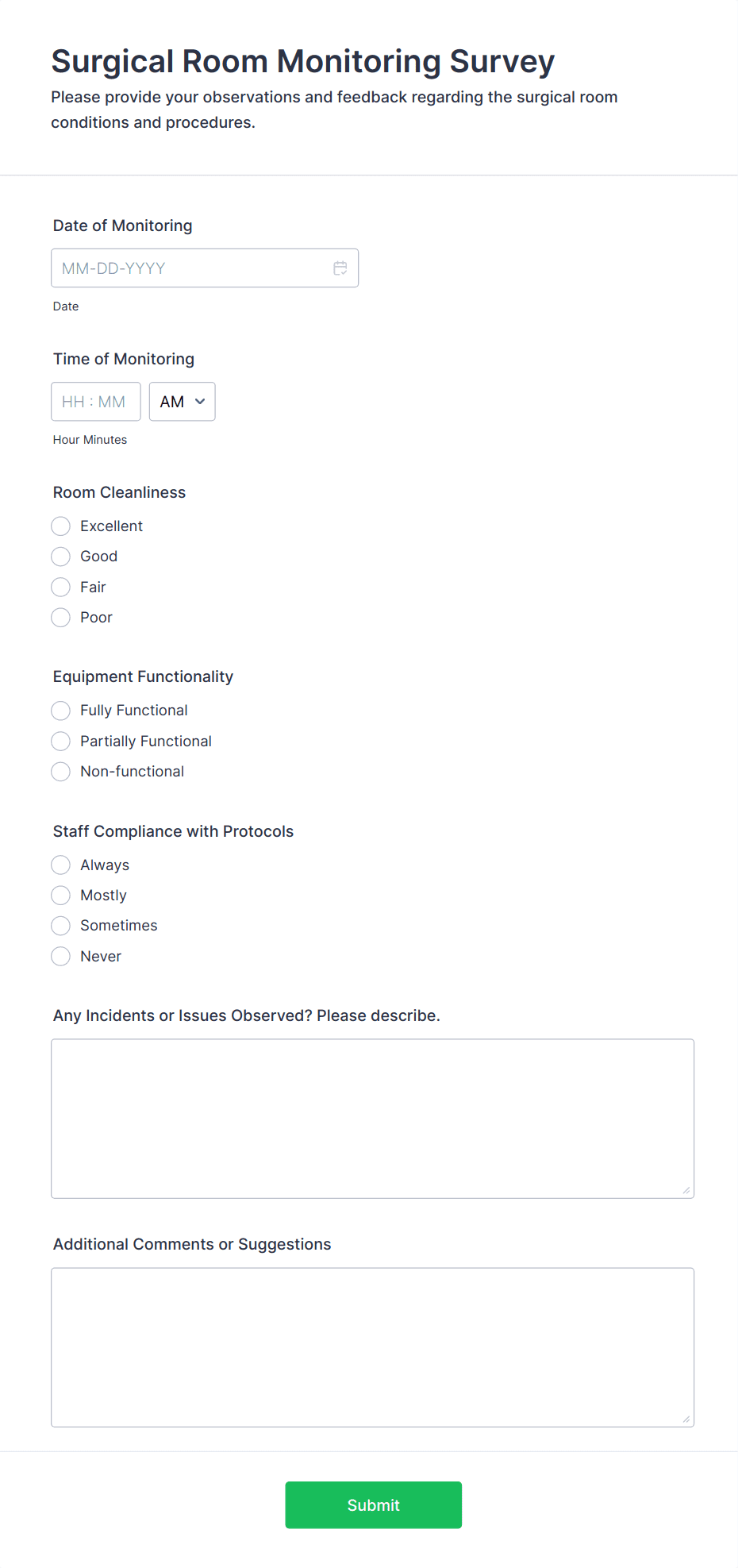 Healthcare surveys are specialized questionnaires designed to collect valuable information from patients, healthcare professionals, and other stakeholders within the medical field. These surveys can be used for a variety of purposes, such as assessing patient satisfaction, gathering feedback on healthcare services, monitoring public health trends, evaluating treatment outcomes, and conducting research studies. Healthcare organizations, clinics, hospitals, and research institutions rely on these surveys to improve patient care, streamline operations, and ensure compliance with industry standards.