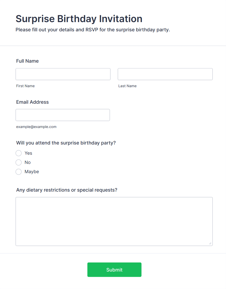 Get the party started with an online Party RSVP Form! Whether you’re hosting a birthday party, office event, or fundraiser, you can seamlessly collect RSVPs from any device.