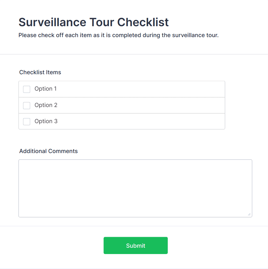 - Safety Monitoring Forms: May include checkboxes for compliance, incident description fields, and photo uploads.