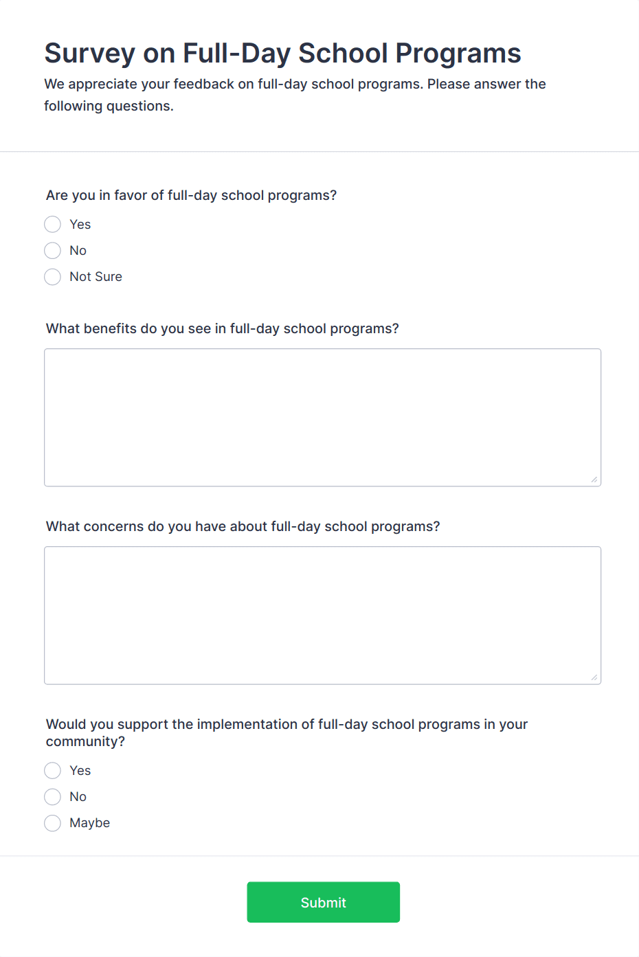 Education surveys are specialized tools designed to gather feedback, opinions, and data from students, teachers, parents, and educational staff. These surveys can cover a wide range of topics, including course evaluations, student satisfaction, teacher performance, classroom climate, learning outcomes, and parental involvement. By collecting structured responses, education surveys help schools, universities, and training centers make informed decisions, improve teaching methods, and enhance the overall learning experience. Use cases range from end-of-term course feedback and campus climate assessments to alumni follow-up surveys and needs assessments for new programs.