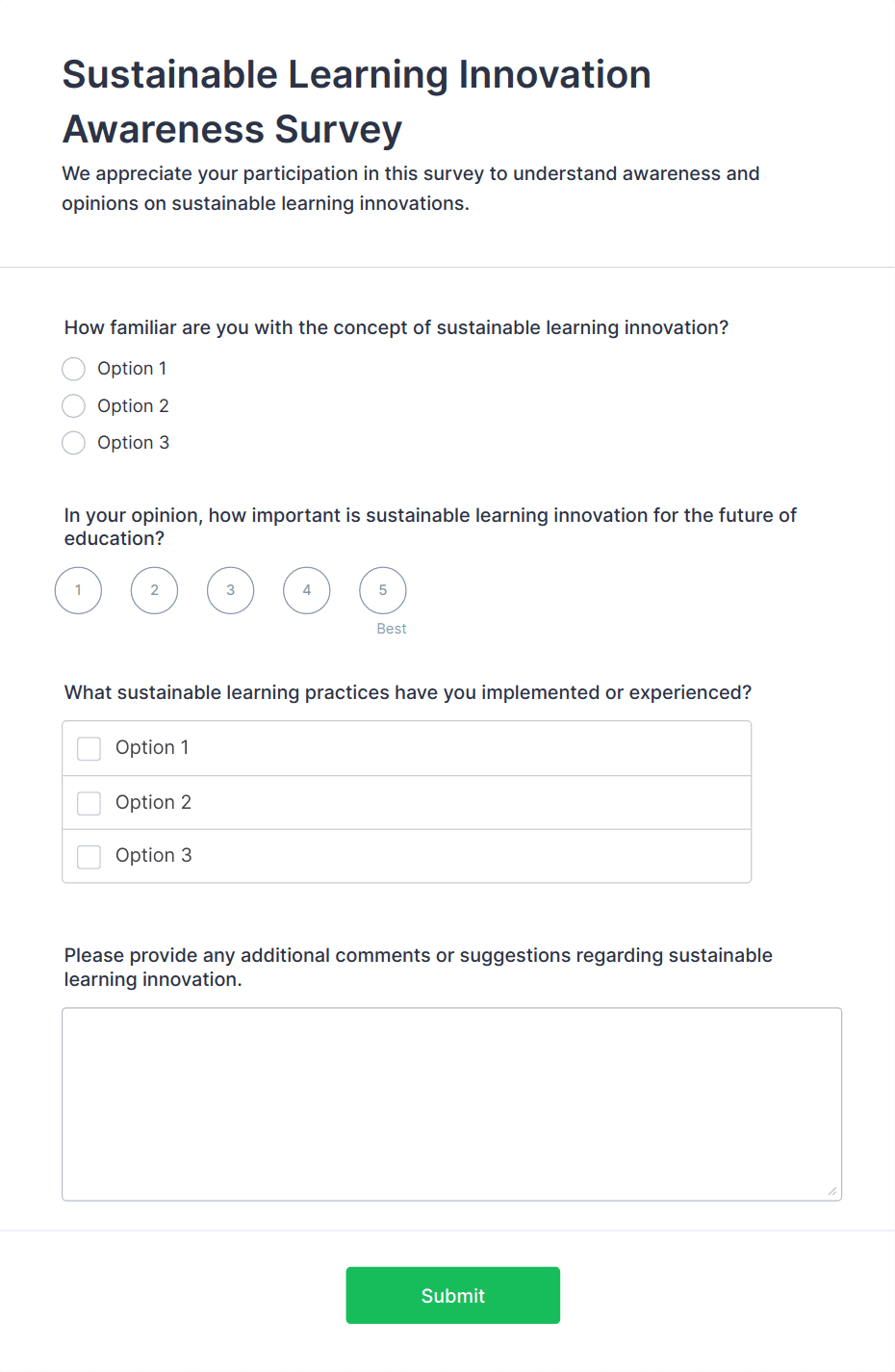 • For teacher or staff surveys: Include self-assessment fields, peer review sections, and narrative response options.