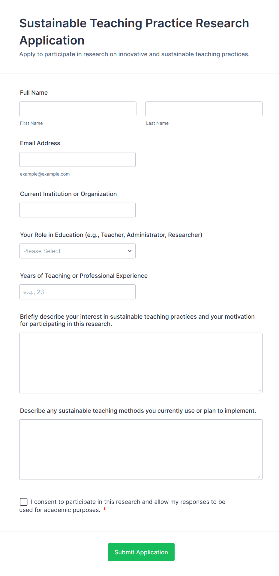 The Sustainable Teaching Practice Research Application Form is used to gather applications from educators and education professionals who want to participate in research focused on sustainable teaching methods and practices.