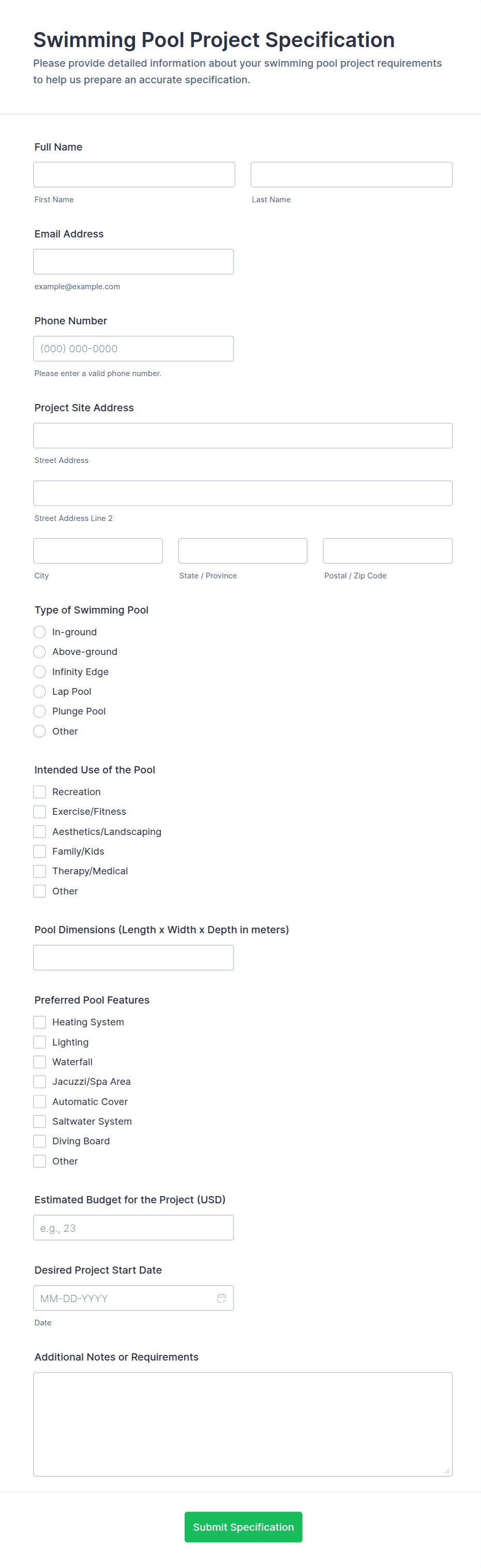 Common fields include project type, site address, scope description, measurements, timeline, material preferences, and file uploads like photos or plans.