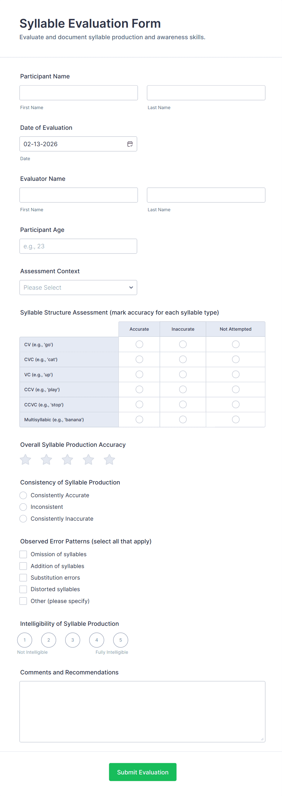 Assessment Form Templates are pre-designed digital forms used to evaluate, measure, or analyze knowledge, skills, performance, or other criteria across a variety of settings. These templates are commonly utilized in education for student assessments, in the workplace for employee evaluations, in healthcare for patient screenings, and in many other fields where structured feedback or data collection is essential. Assessment forms can range from simple quizzes and self-assessments to complex multi-section evaluations, making them versatile tools for gathering actionable insights and supporting decision-making processes.