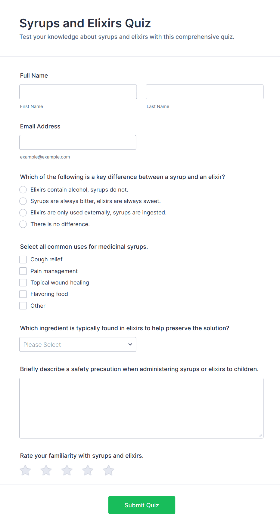Quiz Templates are pre-designed forms specifically created to facilitate the process of building quizzes for a variety of purposes, such as education, employee training, lead generation, event engagement, and more. These templates provide a structured way to present questions, collect answers, and automatically score or evaluate responses. Whether you’re a teacher assessing student knowledge, a business running a product knowledge test, or a marketer creating a fun personality quiz, Quiz Templates offer a flexible foundation to suit your needs. They can be used for online exams, trivia games, onboarding assessments, customer feedback quizzes, and interactive learning modules.
