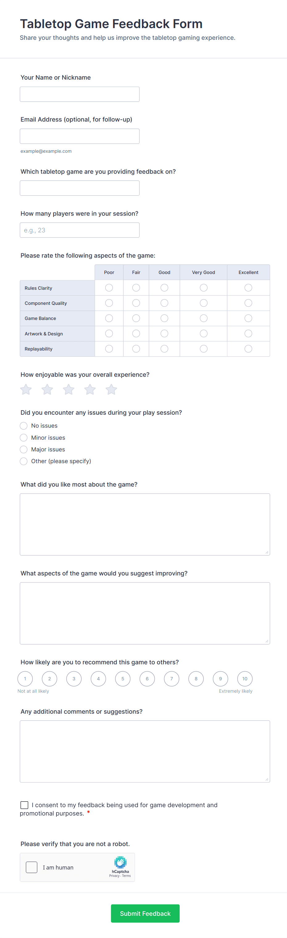 • Product feedback forms may include questions about usability, features, and likelihood to recommend.