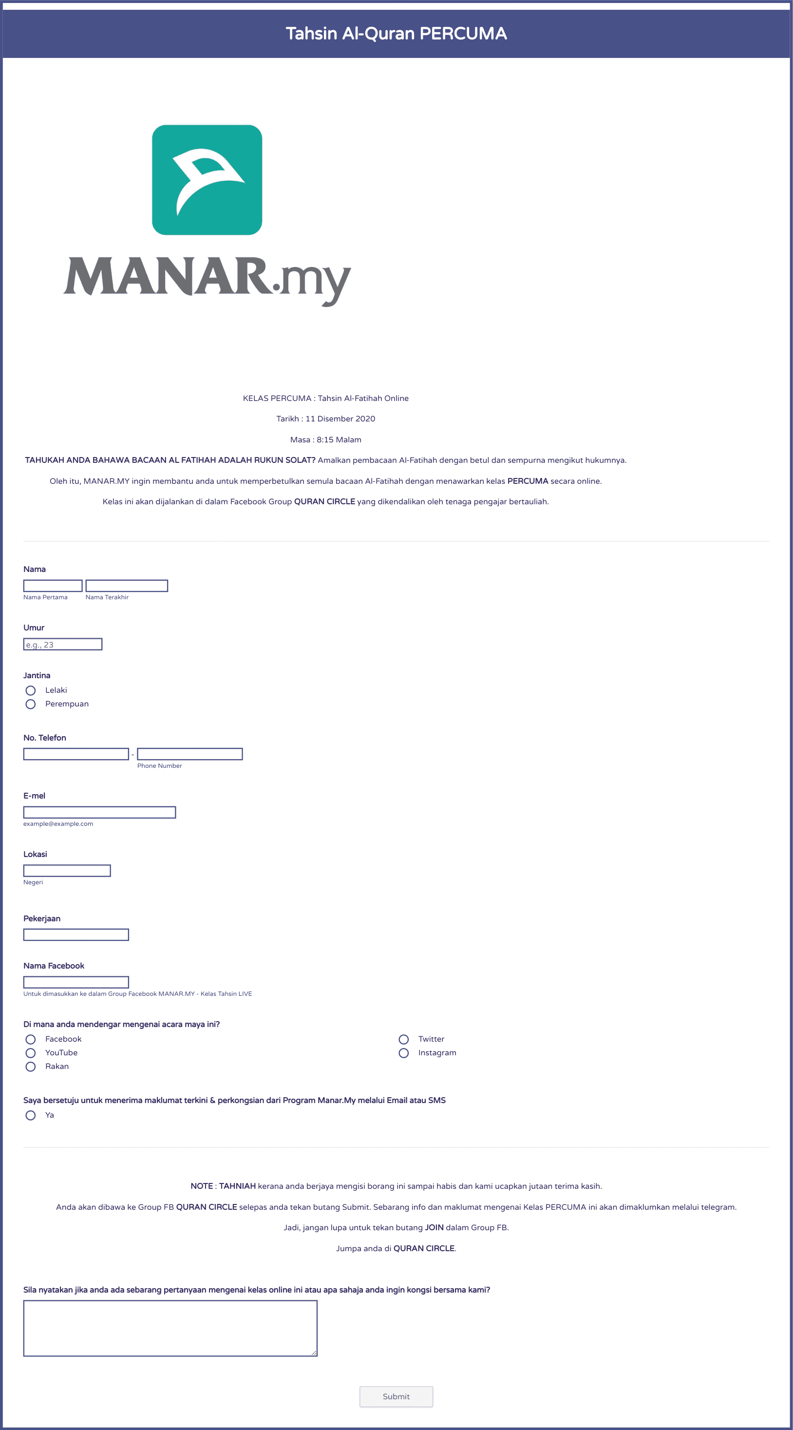 Mobile-optimized Responsive Registration Form designed with a clear header that allows providing a short description of the workshop content, collects primary contact details, allows to make suggestions and add further comments.