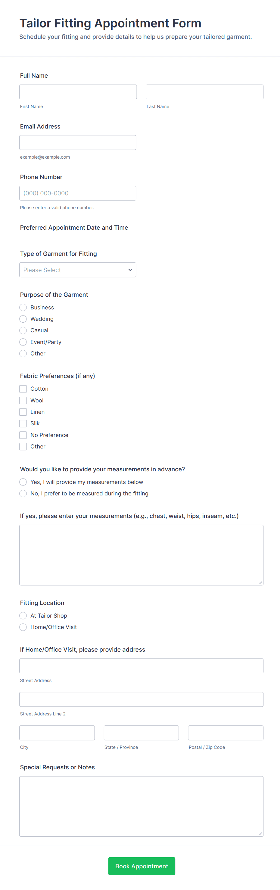 Typical fields include name, contact information, preferred date and time, type of service, and any specific requests or notes. Additional fields may be added based on the industry or service.