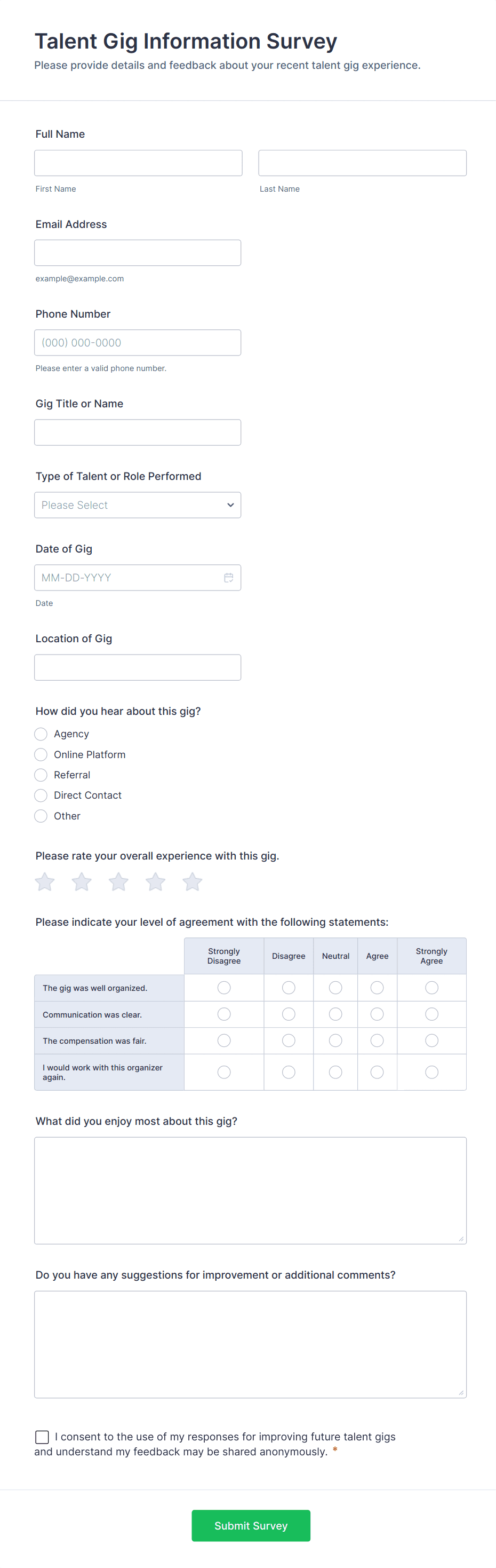 Entertainment Forms are specialized online forms designed to streamline processes within the entertainment industry, including event planning, talent management, audience engagement, and more. These forms can be used for a variety of purposes such as event registrations, ticket bookings, talent auditions, feedback collection, contest entries, and guest list management. Whether you’re organizing a concert, managing a film festival, running a comedy show, or hosting a virtual gaming tournament, Entertainment Forms help you efficiently gather and manage information from participants, attendees, and staff.