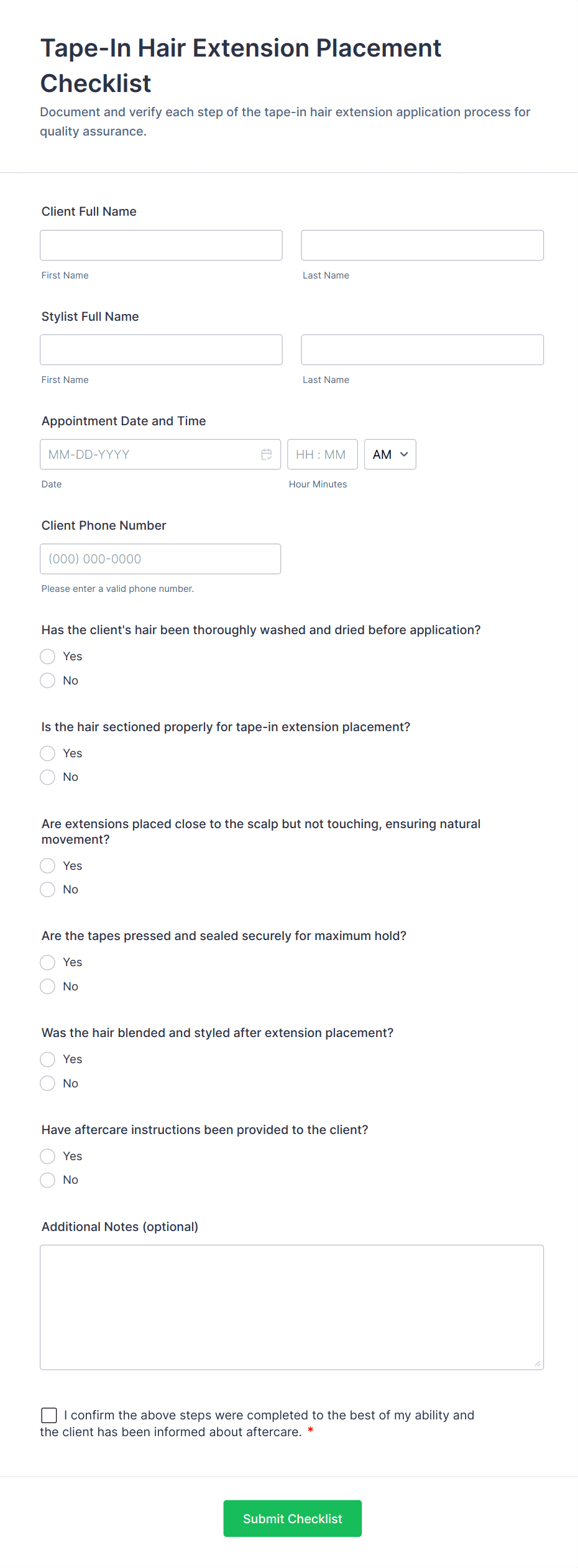 - Salons and spas may use checklists to confirm client preferences, allergies, and service details.