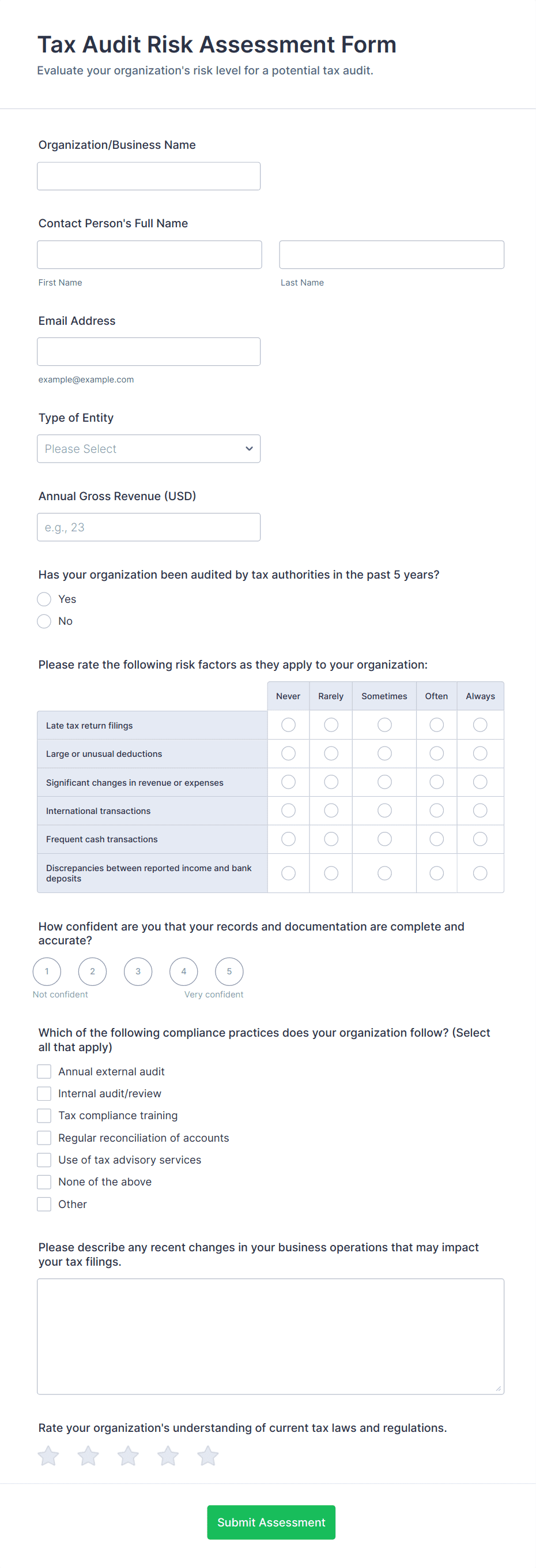 Audit forms are specialized tools designed to systematically evaluate, inspect, or review processes, operations, compliance, or assets within an organization. These forms are commonly used in industries such as finance, healthcare, manufacturing, education, and hospitality to ensure adherence to standards, identify areas for improvement, and document findings. Audit forms can cover a wide range of scenarios, including safety inspections, quality control checks, compliance audits, internal process reviews, and facility assessments. By providing a structured format for data collection, audit forms help organizations maintain accountability, track corrective actions, and support continuous improvement initiatives.