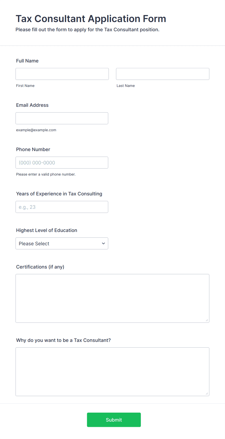 • For job applications, include fields for personal information, education, work experience, references, and file uploads for resumes or cover letters.