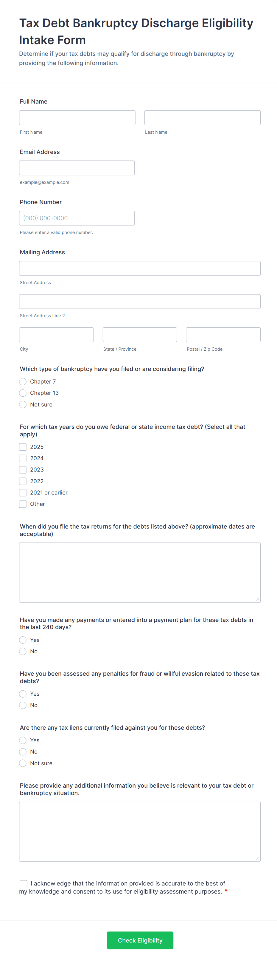 • Client intake for law firms to gather case information and contact details.