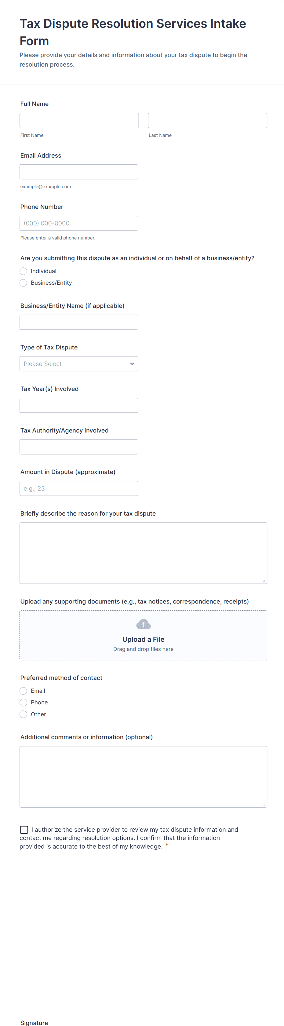 Intake forms are essential tools used to gather preliminary information from clients, patients, customers, or participants before providing a service or beginning a process. These forms streamline the onboarding process by collecting relevant details such as contact information, background data, preferences, and specific needs. Intake forms are widely used across various industries, including healthcare (patient intake), legal (client intake), education (student intake), human resources (employee onboarding), and service-based businesses (client consultations). By standardizing the information-gathering process, intake forms help organizations ensure consistency, improve efficiency, and deliver personalized experiences.