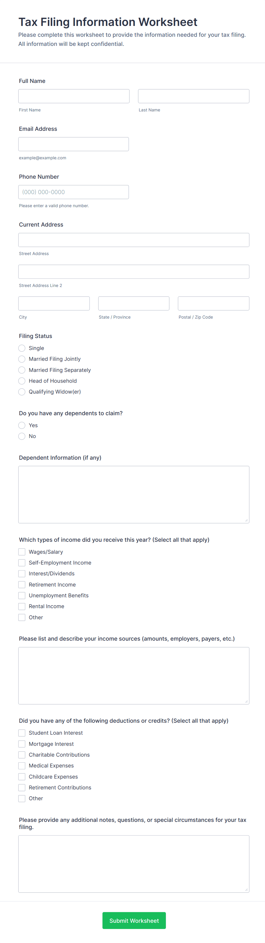 Whether you’re a government agency collecting official tax forms or an accountant gathering information from your clients, securely receive tax information online with Jotform’s Tax Forms! Start by selecting a form template below and customizing it to match your needs and branding. Then share the form or embed it in your website to be filled out on any smartphone, tablet, or computer. Submissions are stored in your secure Jotform account and can be converted into professional PDF documents automatically.