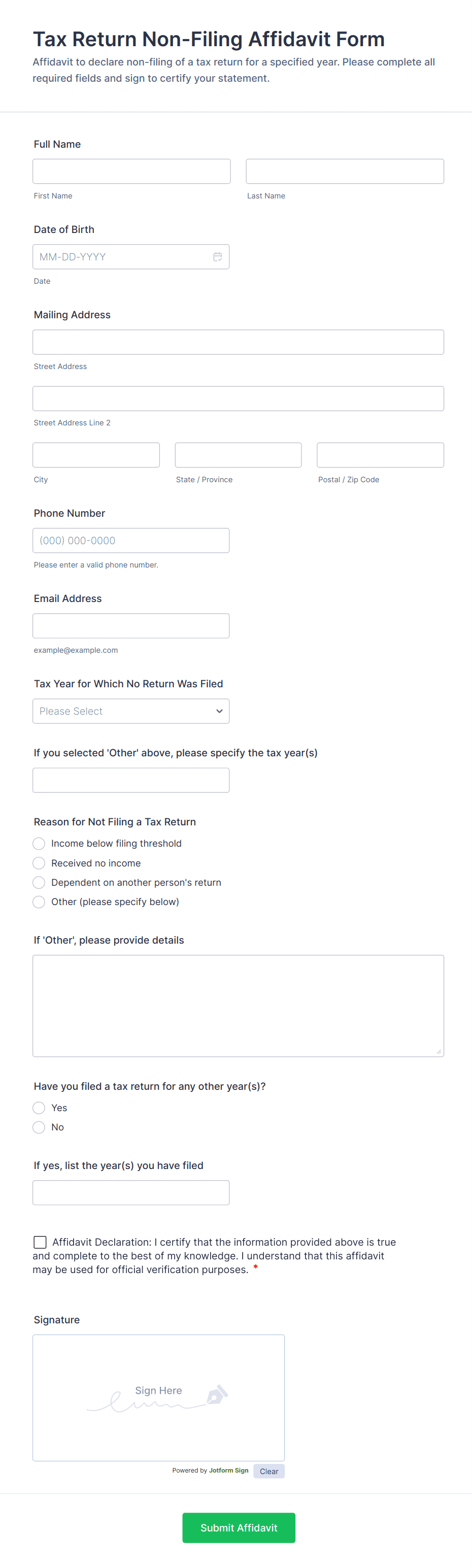 Whether you’re a government agency collecting official tax forms or an accountant gathering information from your clients, securely receive tax information online with Jotform’s Tax Forms! Start by selecting a form template below and customizing it to match your needs and branding. Then share the form or embed it in your website to be filled out on any smartphone, tablet, or computer. Submissions are stored in your secure Jotform account and can be converted into professional PDF documents automatically.