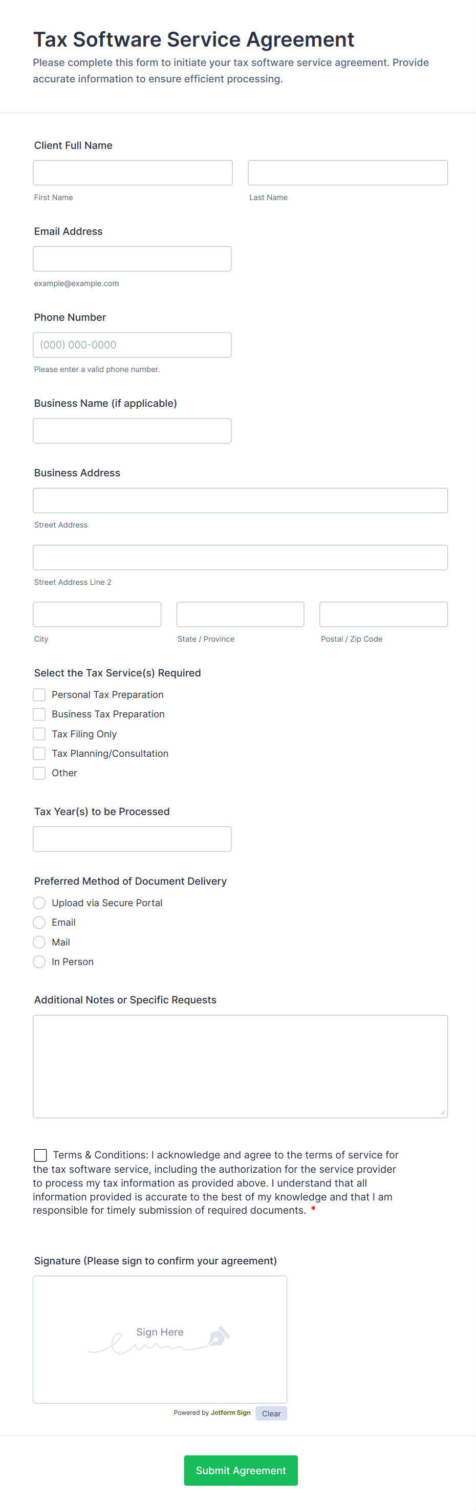 Tax Preparer Agreement Form is a handy template designed to streamline your financial services. It provides a legal framework for tax preparers and clients, assuring transparency and mutual understanding. This form helps avoid disputes, saves time, and enhances your professional image. Simplify your tax preparation process today with Jotform.