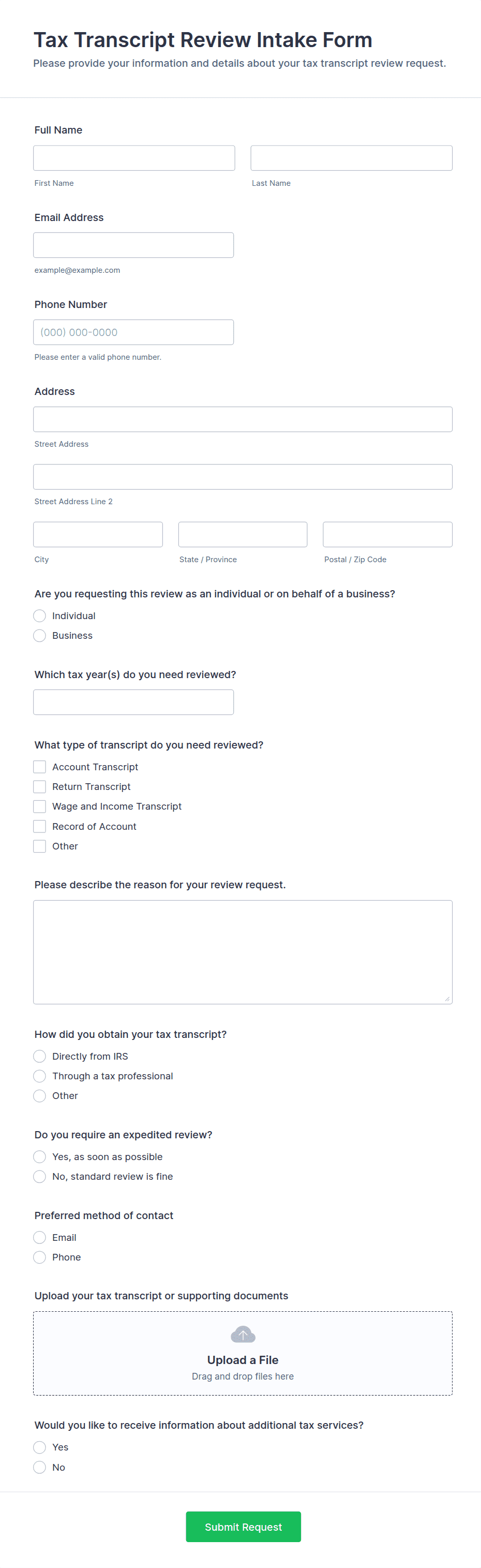 A Tax Preparation Virtual Client Intake Form is a form template designed to collect tax information from clients.