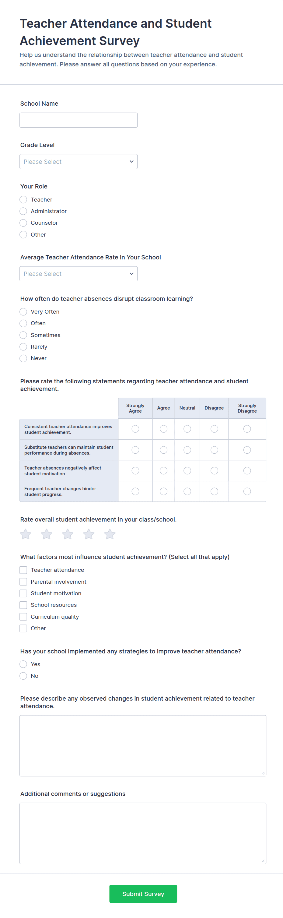 - For teacher or staff surveys: Include self-assessment fields, peer review sections, and narrative response options.