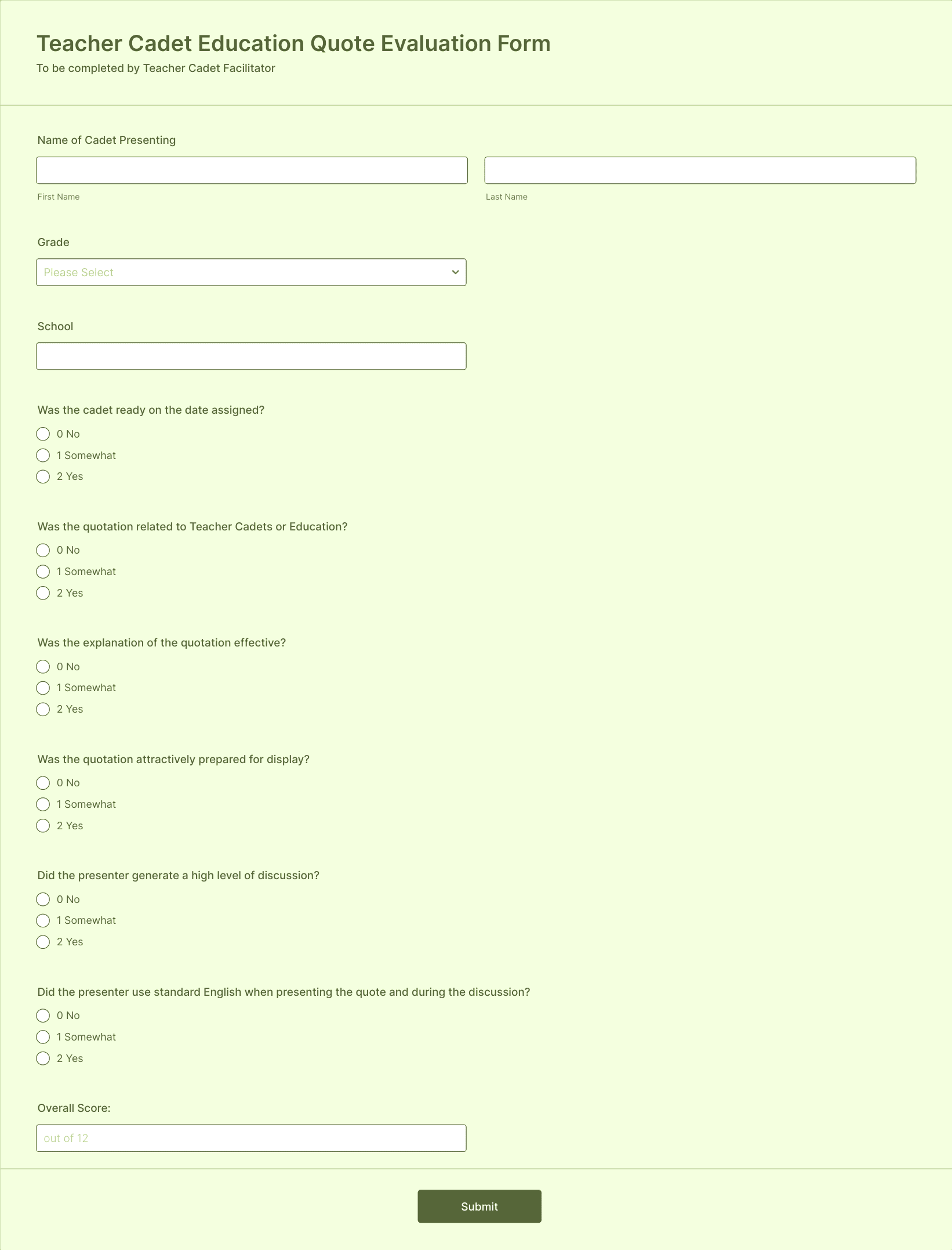 • Basic Fields: Name, date, evaluator’s role (student, peer, admin), teacher’s name.