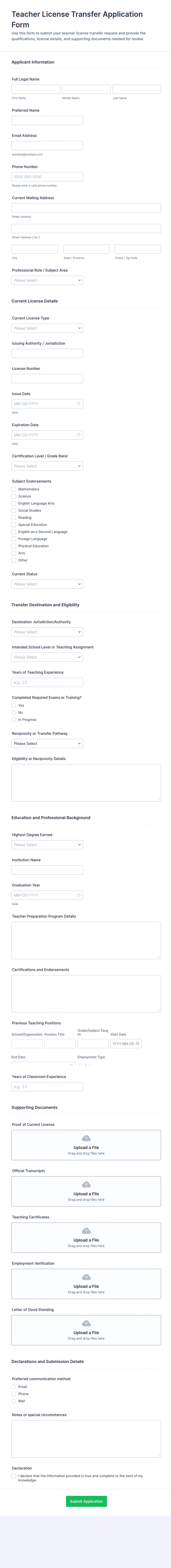 Teachers, school district HR teams, credentialing staff, and education agencies can use this form for data collection related to transfers, reciprocity pathways, and documentation review.