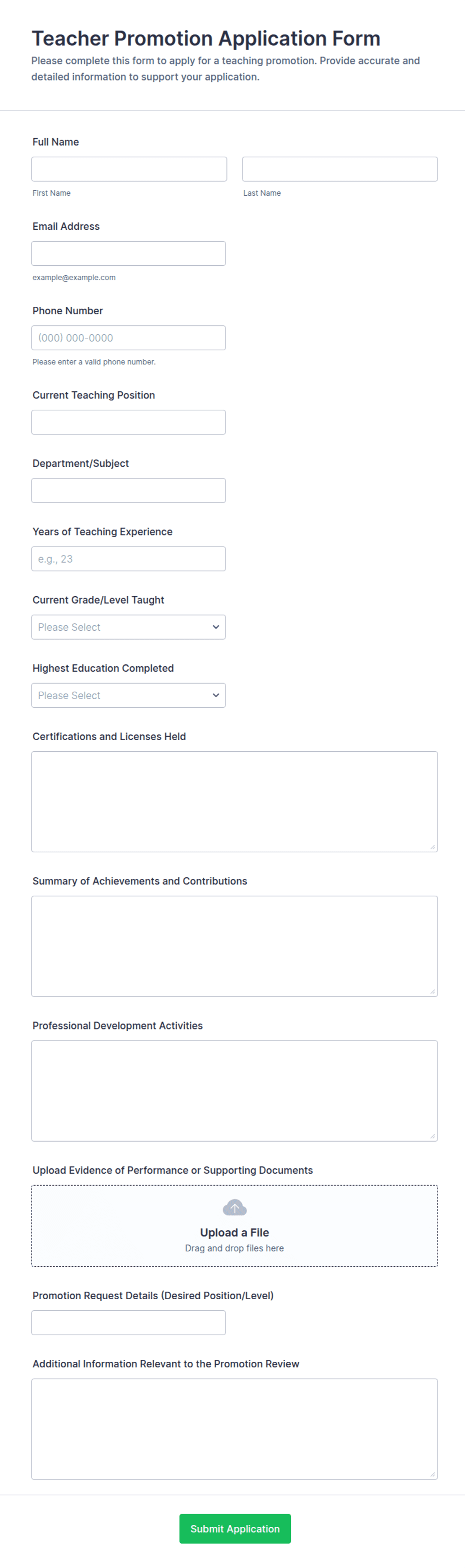 Use it during promotion windows, career advancement cycles, leadership pathway reviews, or any time a school needs a standardized way to collect and evaluate internal advancement requests.